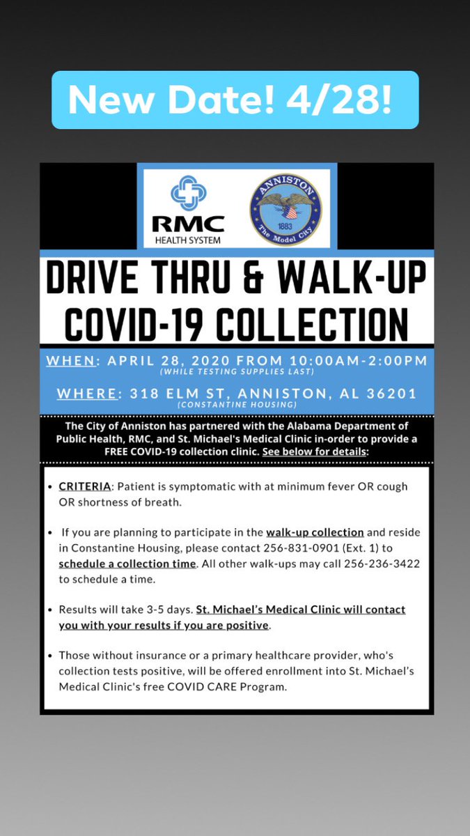 The City Of Anniston On Twitter Please Note The Date Of Our Second Free Covid 19 Collection Clinic Has Changed 318 Elm St Anniston Al 36201 Constantine Housing April 28th From 10am