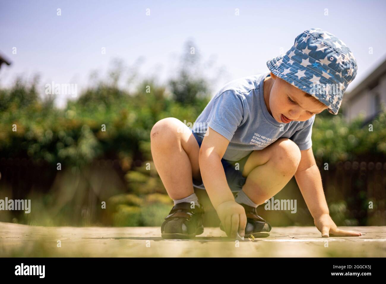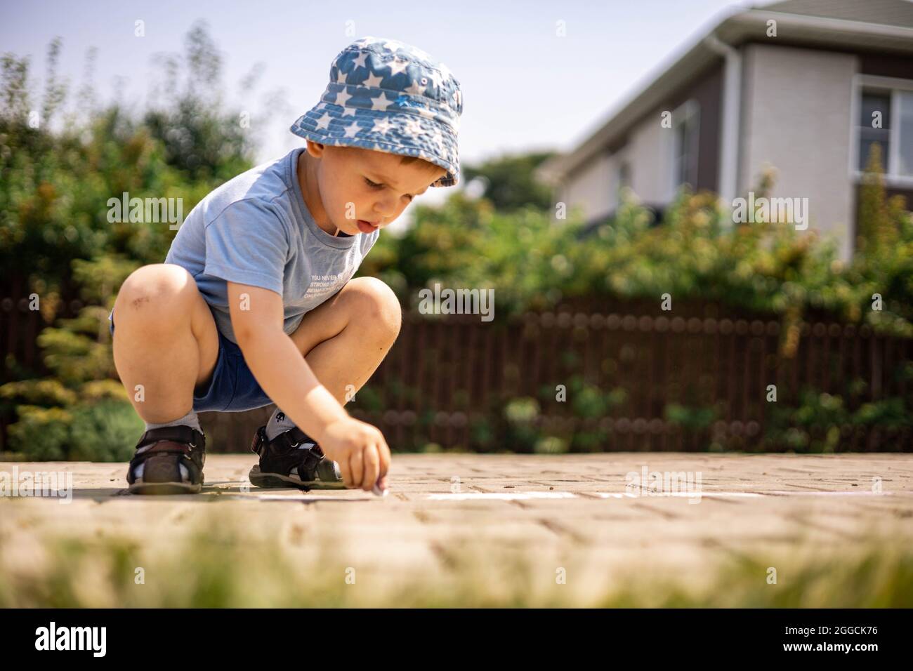 Cheerful Little Boy Drawing Hopscotch With Chalk On Ground Enjoying Happy Childhood At Backyard Stock Photo Alamy